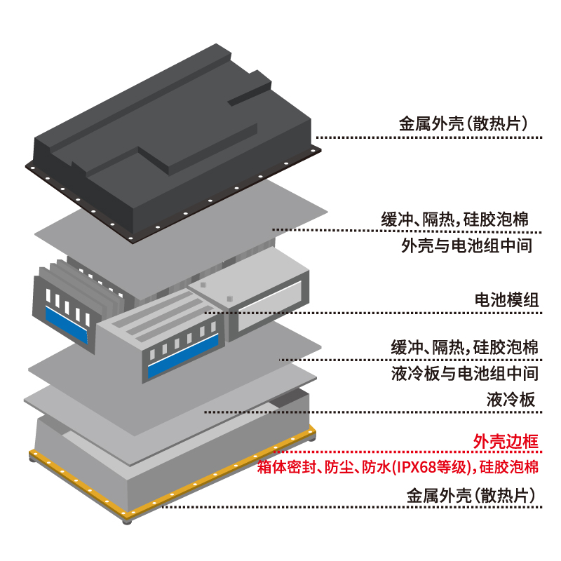 控制電池?zé)岫鹊墓枘z泡棉,位于電池模塊與外部封裝設(shè)備 (Heat-sink) 之間,將模塊內(nèi)部產(chǎn)生的熱量傳導(dǎo)至外部,電池箱體邊框密封、防塵、防水。